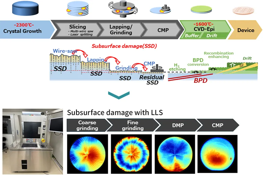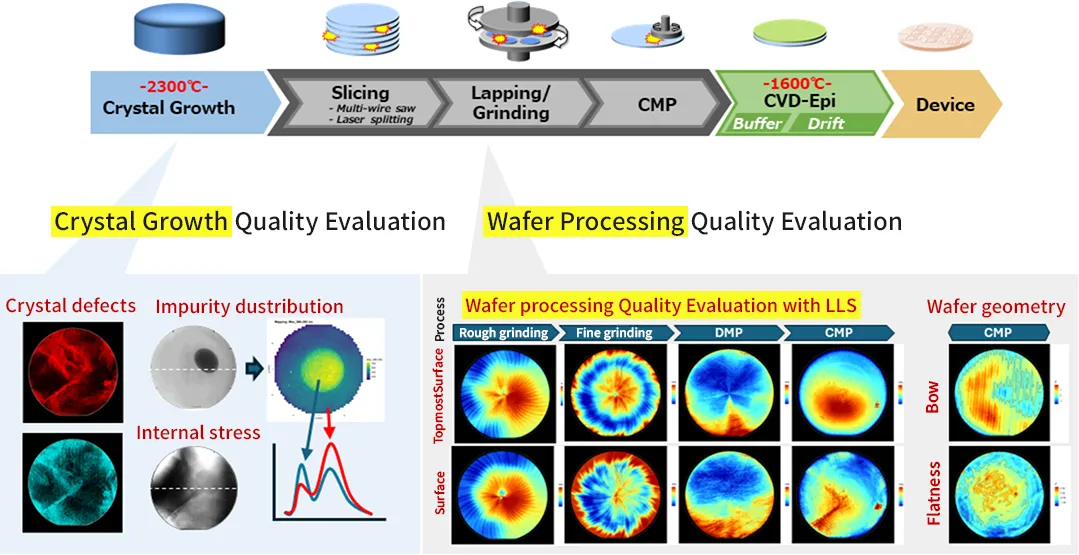 From ingot slicing through subsequent wafer processing steps, processing-induced damaged layers are generated on the wafer surface. It has been reported that these damaged layers can act as the origin of killer defects during the Epi-CVD process. We have independently developed laser Light Scattering –based visualization system for processing-induced strain generated during wafer processing. By using this system, processing-induced strain over the entire wafer surface can be visualized non-destructively.