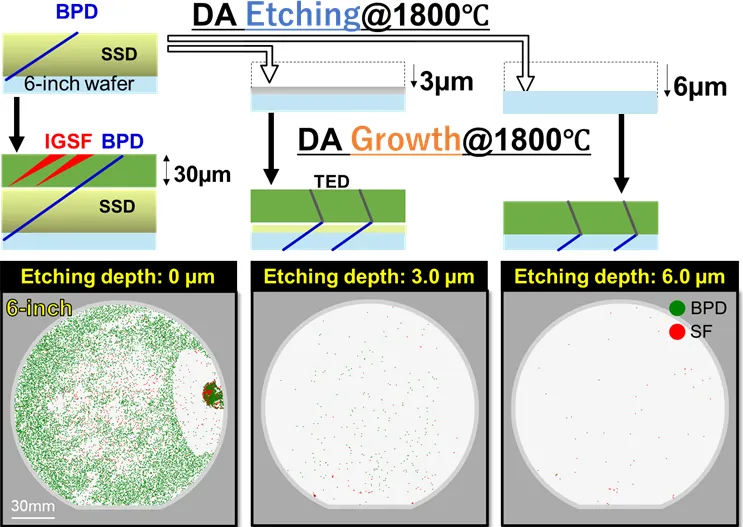 When DA-Etching and DA-Growth are sufficiently applied,processing-induced damage is removed,and BPD and IGSF densities in the DA-grown layer can be reduced to near-zero levels.