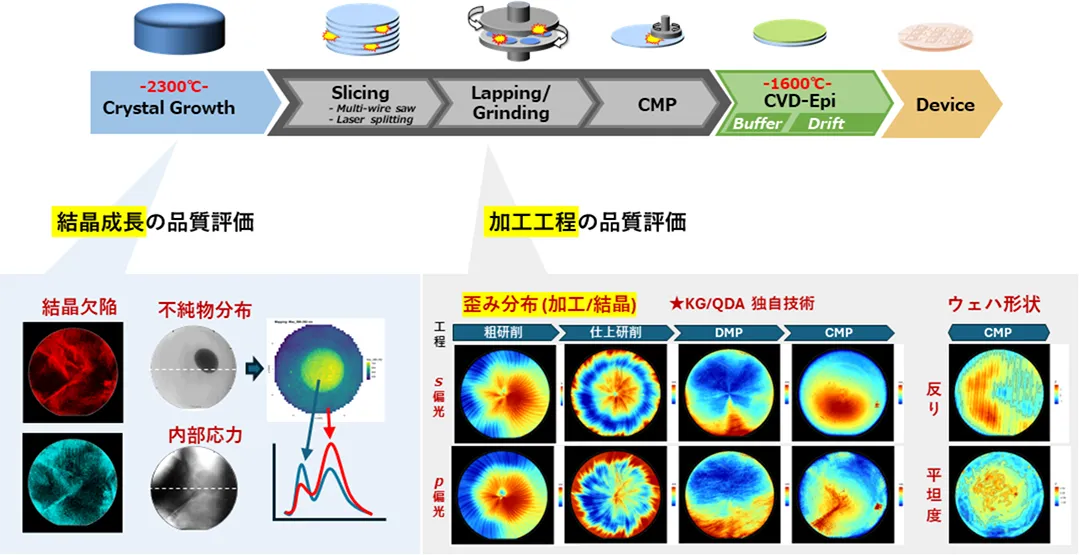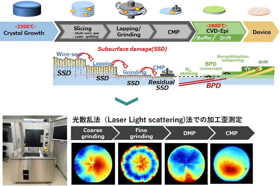 HOME 技術紹介 独自開発した評価ビジネス SiCウエハ品質課題 Dynamic AGE-ing®とは 独自開発した評価ビジネス 独自開発した評価法で何ができるか? 光散乱法による加工歪の計測 インゴット切断からウエハ加工工程にかけて、ウエハ表面には加工歪層(Subsarface damage/SSD)が発生します。 この加工歪層は工程において、キラー欠陥の原因となることが報告されています。 我々は光散乱法を用いた加工工程の歪みの可視化装置を独自開発し、非破壊でウエハ全面の加工歪を可視化することを可能としました。 光散乱法とその他の測定手法を紐づけ、結晶成長とウエハ加工の2つの工程の品質評価が可能